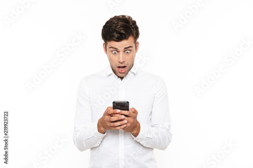 Surprised man with short dark hair chatting or typing text message using cell phone, isolated over white background