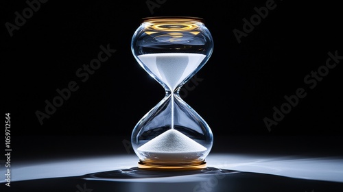 Surreal hourglass disappearing into thin air, subtle light reflections on grey table, black background