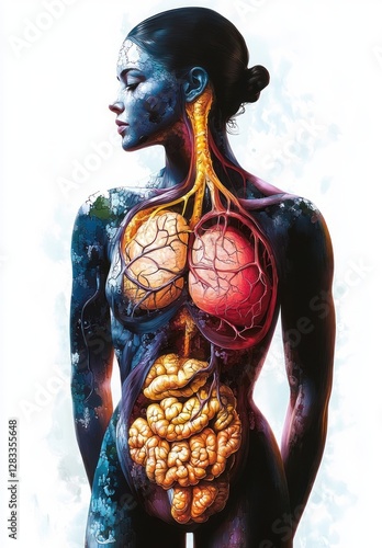 anatomy, human, silhouette, colourful, organ, health, digital, illustration, torso, female, body, stomach, muscle, liver, digestive, system, cross section, medicals, science, drawing, tissue, appendix, spleen, colon, pancreas, uterus, lung, bronchial, esophagus, high contrast, lighting, shadow, asymmetrical, composition, health care, vibrant, artwork, diagram, organ, nubes, phantasmagoric, science, beautiful, creative, visual, concept, imagination, detailed