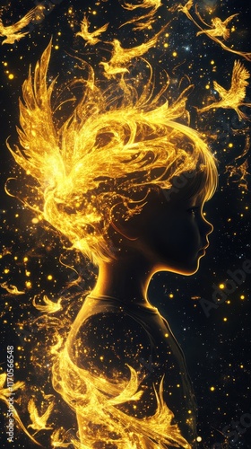 glowing, children, surreal, art, gold, bird, dreamlike, atmosphere, childhood, imagination, aethereal, magical, profile, silhouette, whimsical, light, creativity, portrait, wonder, enchantment, nature, fantasy, beauty, joy, serenity, expression, cosmic, element, playful, vibrant, radiant, imagery, bird, motif, innocence, dream, abstract, colours, contrast, magic, animal, creature, soaring, aglow, aura