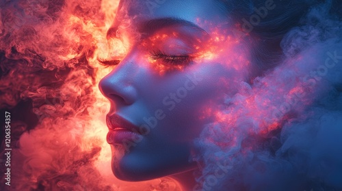 portrait, surreal, fire, smoke, glowing, dramatic, artistic, aesthetic, bold, unique, modern, stylish, vibrant, striking, creative, imaginative, detailed, elegant, powerful, fiery