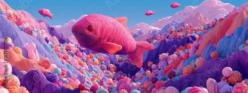 surreal, scene, giant, neon, fish, flying, over, candy, mount, colourful, whimsical, imaginative, vibrant, fantasy, dreamlike, playful, artistic, creative, unusual, landscape, nature, unique, shape, texture, soft, cloud, hue, atmospheric, serene, visual, depth, illustration, relaxing, tranquil, enchanting, mysterious, wave, environment, scenery, conceptual, breathtaking, high-coloured, surrealism, design, artwork