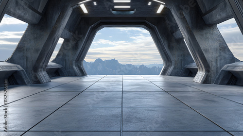 Surreal Sci-Fi Landscape: Futuristic Interior with Stunning Mountain Views