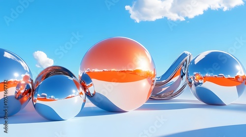 surrealistic scene dominated by a bright orange 3d object with organic forms, featuring an expanded silver chrome abstract shape ruling the sky blue gradient background. mysterious light blue objects