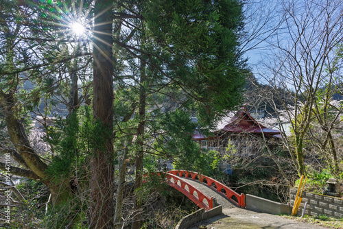 travel, tour tourism, spring, sakura, cherry tree, countryside, japan, shrine, miyazaki, kyushu, holy place, verdure, asia, mountain, mystic, ueno, stream, waterfront, babble, landscape, vermilion, roof, bridge, torii, quiet, healing, season, pigmentation, spot