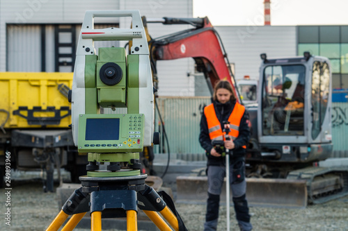 Surveyor engineer with equipment (theodolite or total positioning station) on the construction site of the road with construction machinery background