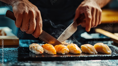 sushi, chef, japanese, cookery, seafood, rice, maki, sashimi, wasabi, ginger, soy sauce, chopstick, eatery, tradition, culinary, fish, fresh, raw, knife, skill, art, presentation, delicious, epicure, food, dining, culture, asia, expertise, preparation, ingredient, technique, favor, seaweed, authentic, hospitality, service