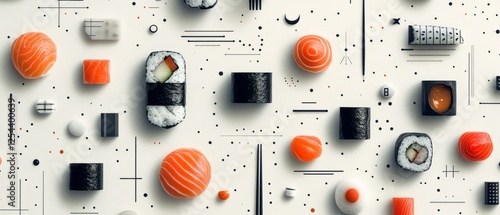 sushi, food, japan, japanese, cookery, salmon, rice, traditional, asia, asian, fresh, healthy, dinner, lunch, epicure, dish, meal, raw, seafood, nori, maki, eatery, tasty, delicious, background, pattern, geometric, shape, minimalist, zen, dot, line, modern, creative
