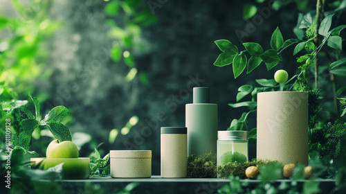 Sustainable beauty products arranged among lush greenery for Green Monday celebration