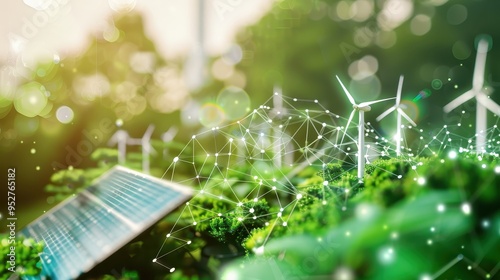 Sustainable energy concept with solar panels and wind turbines amidst lush greenery and digital network connections, representing clean technology.