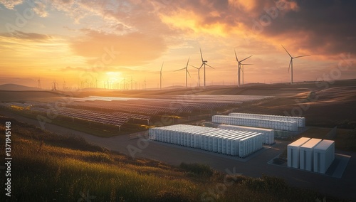 Sustainable Energy: Solar Panels, Wind Turbines, and Battery Storage Powering a Clean Energy Future at Sunset