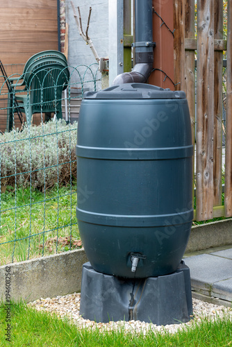 Sustainable gardening solution. black plastic water butt with tap for rainwater harvesting in a domestic backyard, using free water from the sky to water your plants,reduction of drink ater consumptio