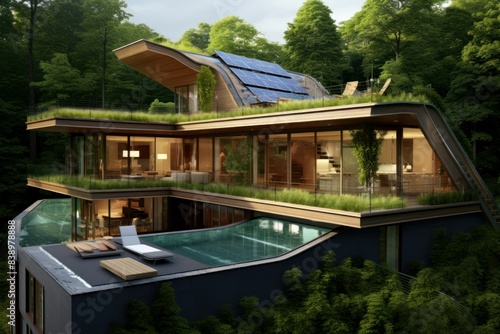 sustainable, living, eco, friendly, house, solar, panel, green, roof, modern, architecture, luxury, home, forest, setting, environmental, conservation, energy, efficiency, natural, surrounding, innovative, design, residential, structure, building, timberland, renewable, contemporary, glasses, wall, lush, vegetation, calmness, landscape, habitat, cutting, edge