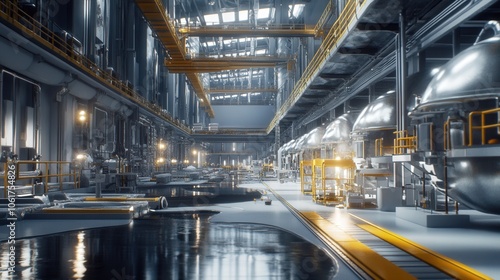 Sustainable production process within a state-of-the-art manufacturing facility, highlighting the use of eco-friendly materials, waste-to-energy systems, and efficient resource management practices