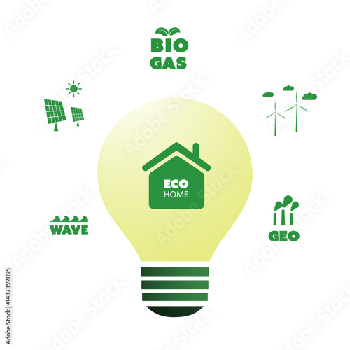 Sustainable Resources, Renewable, Reusable Green Energy Concept with Bright Glowing Lightbulb and Symbols of Various Alternative Power Generation Methods Around. Smart Home Design, Vector Illustration