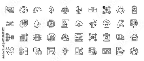 technology, energy, sustainable, green, icon, vector, set, line, pictogram, datum, center, environment, power, reusing, electricity, consumption, server, computing, eco, renewable, cooling, chips, water, leaf, gauge, dam, wind, solar, turbine, building, cloud, storage, network, efficiency, diagram, footprint, bamboo, delivery, house, battery, security, analysis, smart, automation, adjustable, outline