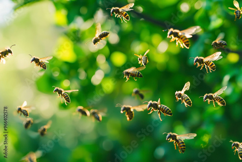 Swarm of dangerous insects striped wasps flying against the backdrop of a green garden.