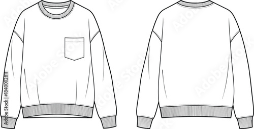 Sweatshirt technical fashion sketch, front and back view, chest pocket, ribbed cuffs, cad drawing flat vector illustration design