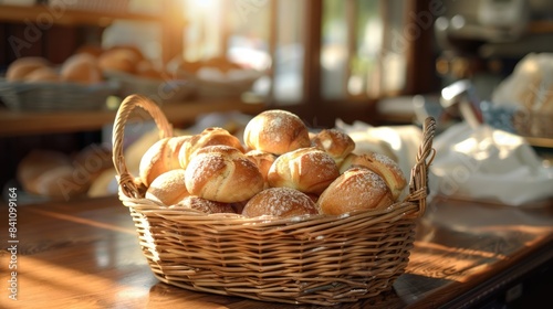 Sweet bread buns in wicker basket on a shop counter in bakery