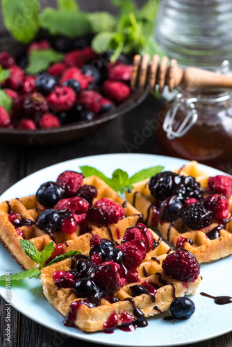 banana, belgian, berry, berry, blackberry, blueberry, breakfast, chocolate, closeup, cream, delicious, dessert, food, fresh, fruit, gold, epicure, homemade, honey, ice, maple, maple syrup, morning, pastry, plate, sauce, snack, strawberry, sweet, sirup, tasty, wafer, waffle, white, deliciously