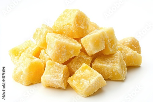 Sweet Candied Ginger Cubes Golden Yellow Delicious Treat Bright White Background