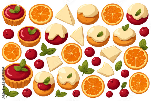 Sweet dessert assortment with tart, cream, and fruits arranged neatly on a white background