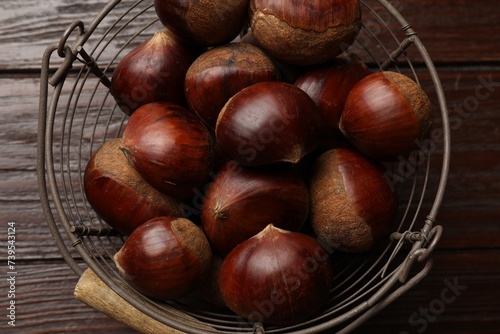 Sweet fresh edible chestnuts in metal basket on wooden table, top view