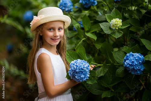 Sweet girl in a hat and white dress walks in the botanical garden on a summer day.