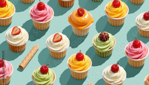 Sweet indulgence of colorful ice cream concept. Colorful cupcakes with cherries arranged on a light blue background.
