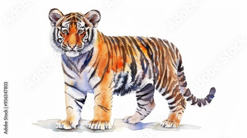 Sweet Tiger Cub Illustration, charming watercolor depiction of a curious tiger cub with detailed fur texture, ideal for children's literature, ample space for text integration.