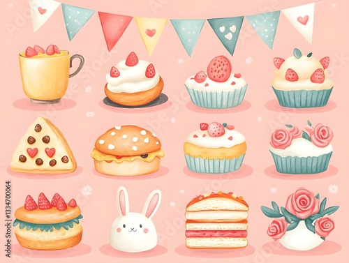 cake, cupcake, sweet, dessert, watercolor, illustration, food, pastry, baked goods, confectionery, bakery, treat, strawberry, chocolate, cream, sugar, baking, celebration, party, birthday, event, sweet tooth, indulgence, delicious, tasty, deliciously, epicure, assorted, collection, decorative, design, art, artistic, beautiful, delightful, festive, handcraft, homemade, creative, pattern, background, pink, flag, rabbit, heart, decoration, gourmet food, icing