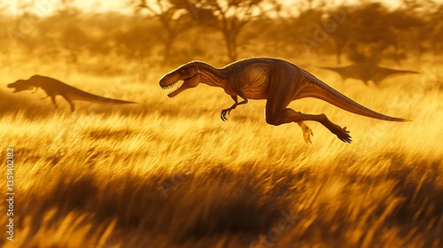 swift, sprinting, open, field, long, leg, forward, desperate, escape, lurking, predator, gold, sunset, prehistoric, grass-land, warm, light, jurassic, diplodocus, pterodactyl, paleontology, tyrannosaurus, bird of prey, dinosaur, triceratops