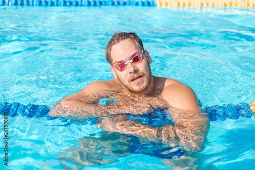 Swimmer in underwater goggles resting in the pool. Summer sport