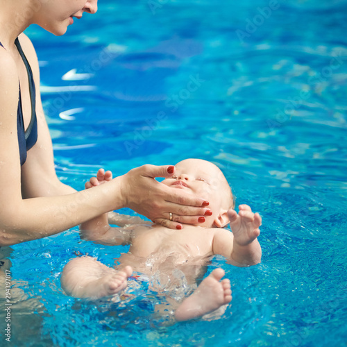Swimming lessons for newborns with mothers in paddling pool. Blue turquoise water on background. Parental care and parenting, healthy lifestyle, wellness program, water rehabilitation, aquatherapy