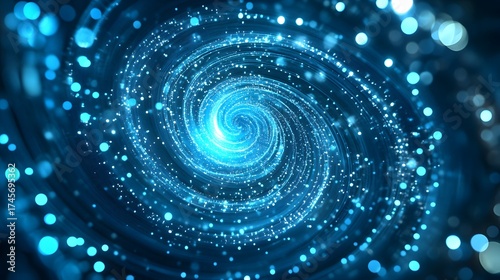 Swirling luminous particles form a blue energy vortex with bokeh effects.