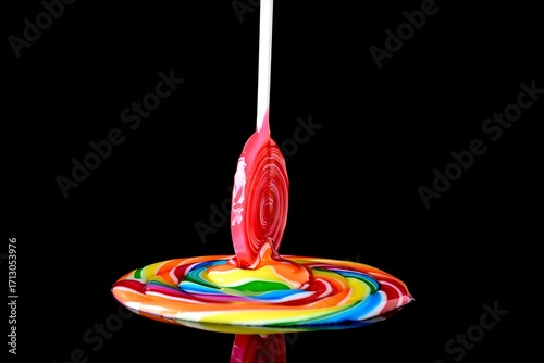 lollipop, candy, sweet, sugar, treat, dessert, confectionery, colourful, rainbow, swirl, spiral, round, disc, stick, red, vibrant, bright, studio shot, isolated, black background, food, childhood, nostalgia, fun, playful, snack, sweetness, temptation