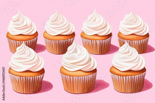 cupcake, dessert, sweet, frosting, cream, pink, background, bakery, food, delicious, tasty, treat, snack, vanilla, isolated, sugar, baked, celebration, party, illustration, vector, graphic, design, fresh, homemade, confectionery, cake, pastry, epicure, indulgent, deliciously, 7, many, group, row, arranged, symmetric, art, drawing, digital artwork, stylised, cartoon, nobody