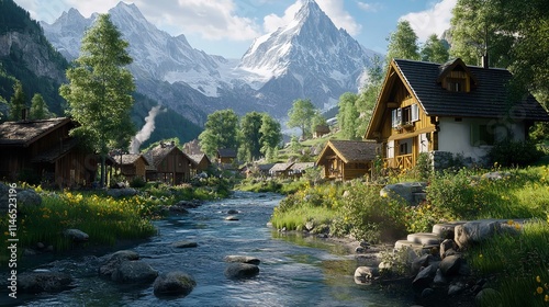 Swiss Landscape with River Stream and Houses 16K Resolution