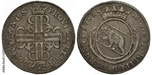 Switzerland Swiss Bern Berne coin twenty kreutzer 1758, cross-like pattern with crowns, bear in oval shield, crown on top, branches at sides, silver,