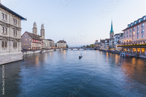 Switzerland, Zurich, River Limmat, Limmatquai, Town hall, Great minster and Fraumuenster Church