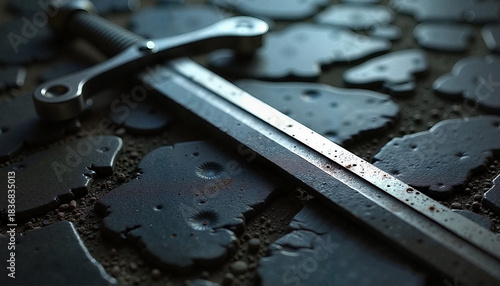 sword, weapon, blade, steel, cobbled, wet, dusk, dark, metal, mediaeval, no people, battle, knight, warfare, defense, danger, fantasy, historical, combat, armoring, shiny, rain, moisture, ground, street, stone, texture, dramatic, tension, power, strength, symbolism, cold, solitude, mystery, heroic, ancient, vintage, warrior, night, scene, mood, storytelling, sharp, object, security, adventure, discipline