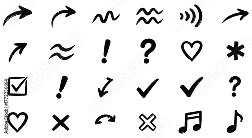symbol, icon, grid, design, arrow, wave, sound, mark, nubes, music, note, check, box, question, exclamation, punctuation, curved, straight, squiggle, abstract, interface, communication, vignetting, hand-drawn, black, white, contrast, minimal, graphic, set, collection, creative, playful, expressive, layout, pattern, style, concept, visual, element, bold, simple, artistic, modern, quirky, assorted
