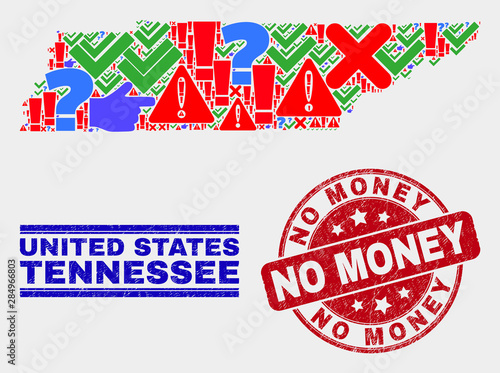 Symbol Mosaic Tennessee State map and stamps. Red rounded No Money distress stamp. Bright Tennessee State map mosaic of different randomized symbols. Vector abstract composition.