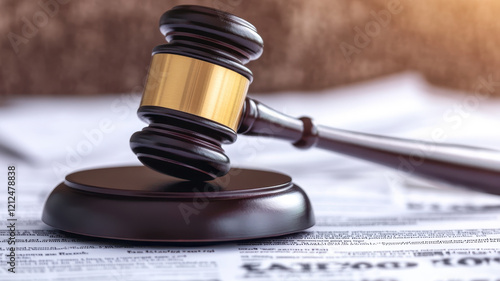 symbolic gavel striking pile of tax documents, representing legal authority and financial matters. image conveys sense of seriousness and importance in legal proceedings