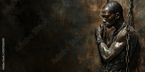 illustration, chained, african, slave, black, man, symbolic, dark, background, copy, space, africa, repression, suffering, injustice, racism, human, right, slavery, oppression, struggle, pain, strength, resilience, imprisonment, freedom, violence, rebellion, identity, cultural, heritage, deep, memory, survival, forced, hardship, despair, anger, sorrowful, brutality, captive, resistance, art, expression