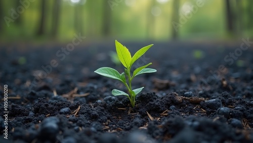 rebirth, destruction, earth, blackened, charred, green, sapling, field, growth, hope, nature, environment, arid, desolate, renewal, life, solitude, resilience, survival, regeneration, contrast, symbolism, barren, emergence, plant, transformation
