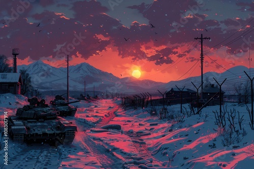 confrontation, nato, russia, force, tank, soldier, snowy, border, barbed, wire, dark, sky, tension, conflict, military, landscape, shadow, cold, standoff, gloaming, winter, mountain, ominous, patrol, division, territory, strategy, peace, war, threat, defense, troop, icy, remote, isolation, nature, twilight, security, surveillance, bleak, readiness, power, clash