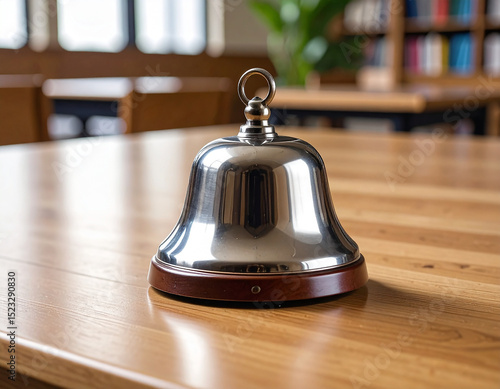 Symbolic Start, Clean Still Life of a School Bell on a Polished Wooden Surface