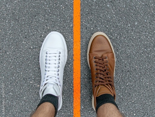 shoe, hip, fashion, symmetry, disparity, opposite, white, path, stylish, abstract, footwear, sneaker, grey, foot, decision-making, boundary, decision, selecting, brown, foot, choosing, topview, contemporary, pathway, choice, texture, topview, asphalt, option, symbolic, contrasting, street, concept, leather, pair, conceptual, individuality, surface, walking, 2, bright