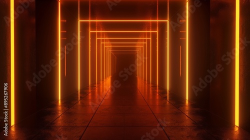 abstract, futuristic, orange, neon, light, glowing, line, background, corridor, tunnel, perspective, empty, dark, symmetry, geometric, modern, architecture, interior, design, science, fiction, technology, energy, power, vibrant, aglow, bright, illuminated, shiny